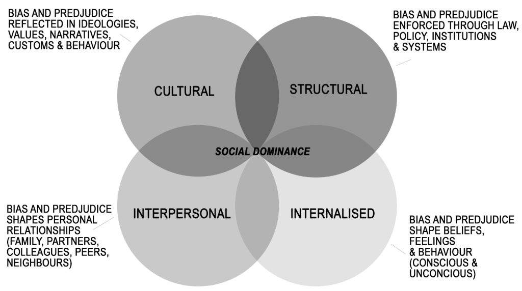 - How does your society express forms of bias and prejudice along these lines of identity? (Explore this question through the lenses of: Structural, Cultural, Interpersonal, Internalised – see the graphic above)